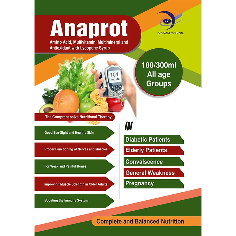 Anaprot 100/300ml is a balanced nutritional supplement designed for all age groups to support overall health and wellness. Enriched with essential amino acids, multivitamins, multiminerals, and antioxidants, it provides complete nourishment for the body. The amino acids help in building and repairing tissues, promoting muscle strength and growth. Multivitamins and multiminerals support immunity, enhance energy levels, and ensure proper functioning of vital organs. Antioxidants in Anaprot help combat free radicals, reducing oxidative stress and promoting overall vitality. Suitable for children, adults, and the elderly, it addresses nutritional gaps in daily diet, supports growth, and aids in maintaining optimal health. Anaprot 100/300ml is an easy-to-consume, safe, and effective solution for sustaining balanced nutrition and well-being for every individual.