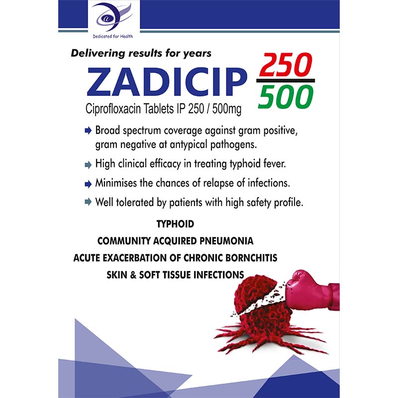 Zadicip Tablets contain Ciprofloxacin, a broad-spectrum antibiotic belonging to the fluoroquinolone class, available in 250 mg and 500 mg strengths. It is specially formulated to combat a wide range of bacterial infections by inhibiting bacterial DNA gyrase, effectively stopping bacterial growth and reproduction. Zadicip is used to treat urinary tract infections, respiratory tract infections, gastrointestinal infections, skin and soft tissue infections, and certain sexually transmitted infections. Its fast absorption and high bioavailability ensure rapid action against susceptible bacteria. The tablets are manufactured under stringent quality standards, ensuring safety, efficacy, and consistency. Zadicip Tablets provide reliable antibacterial therapy, promoting quick recovery while helping prevent complications associated with bacterial infections, making it a trusted choice for physicians and patients.